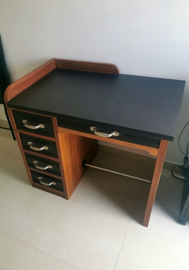 Rajeunissement de ce petit bureau des années 30 que ma cliente a hérité de sa maman: finition peinture noire et vernis mat, parties au naturel vernies mat, quincailleries nettoyées et vernies.